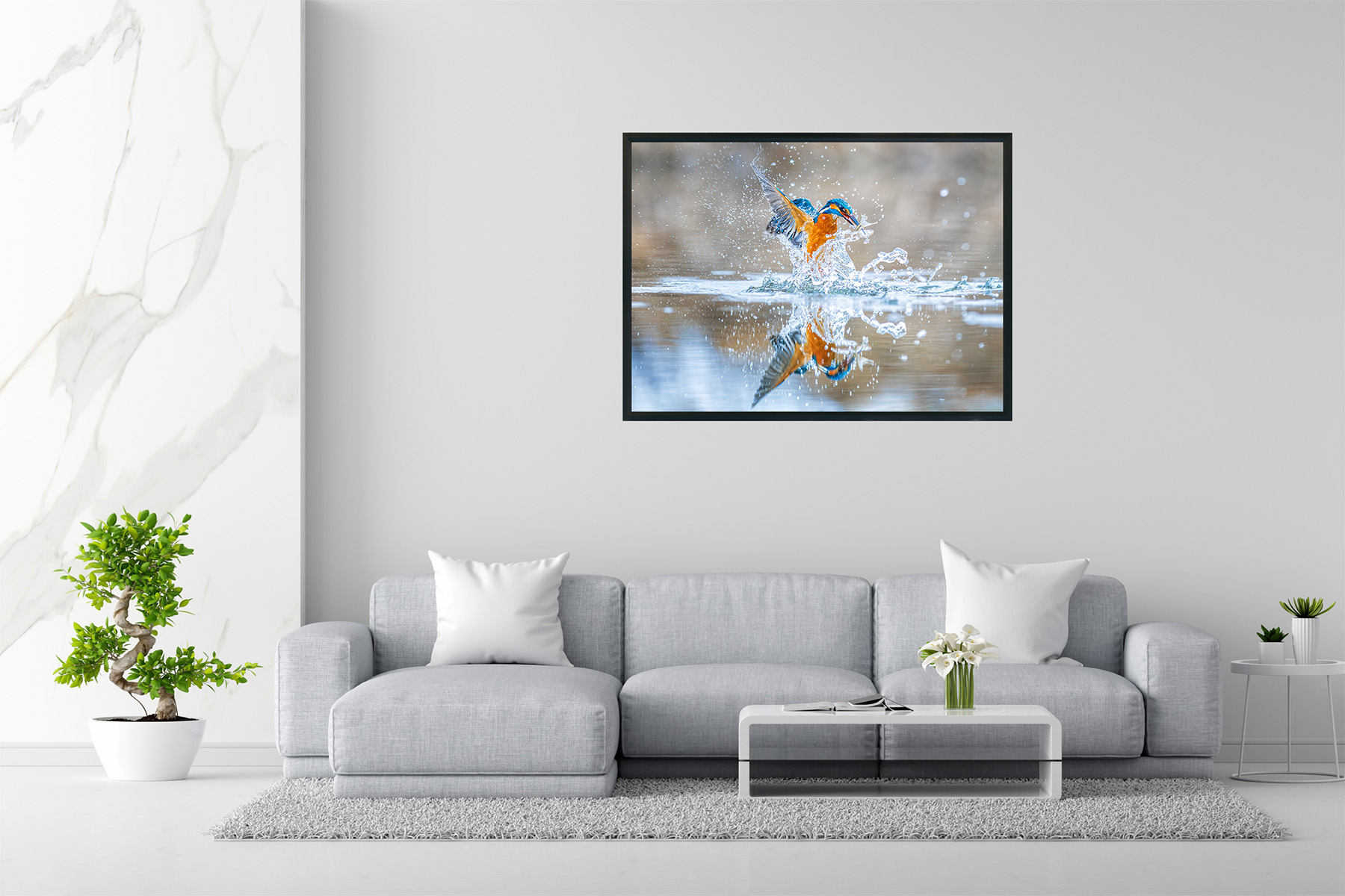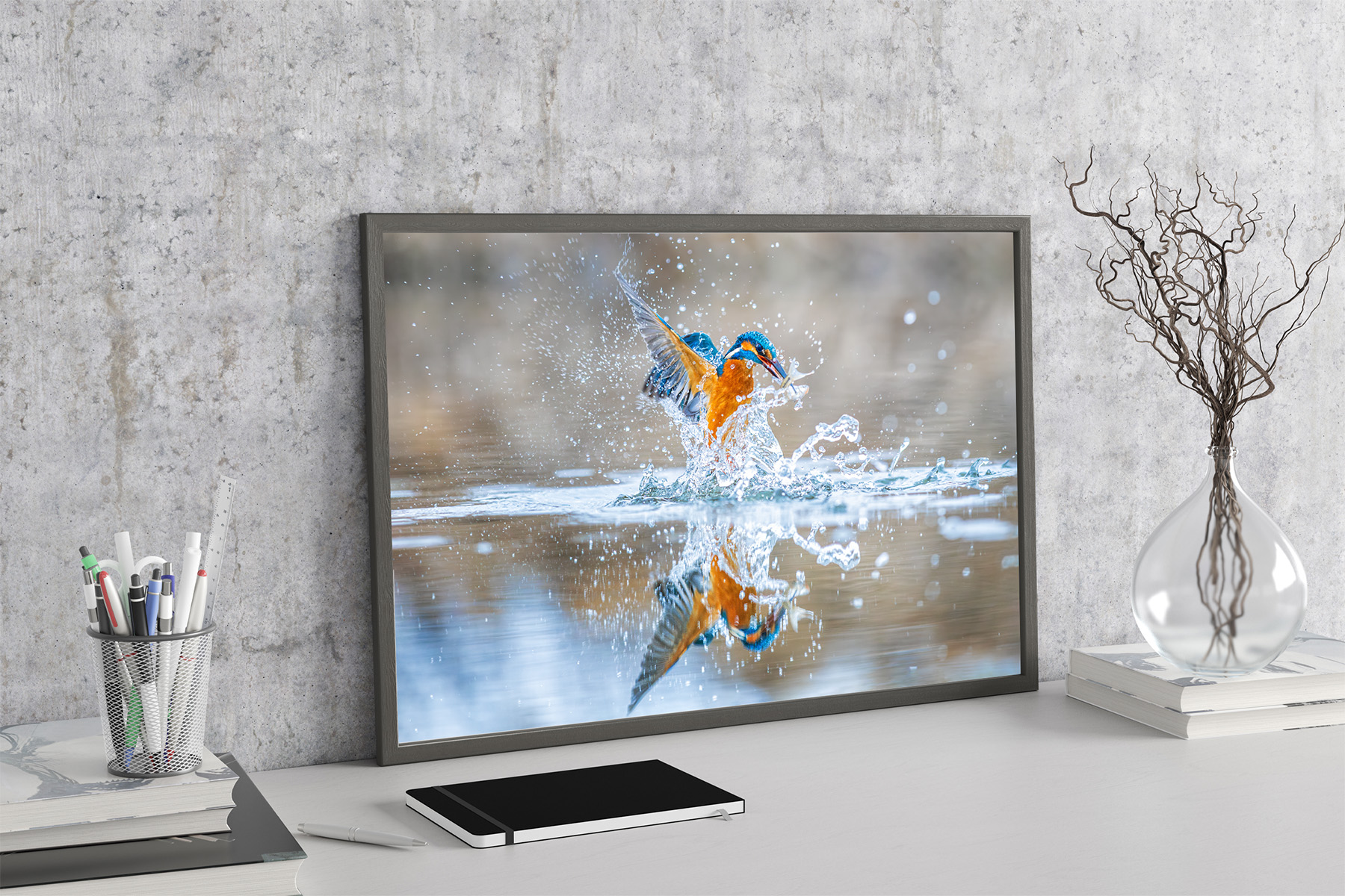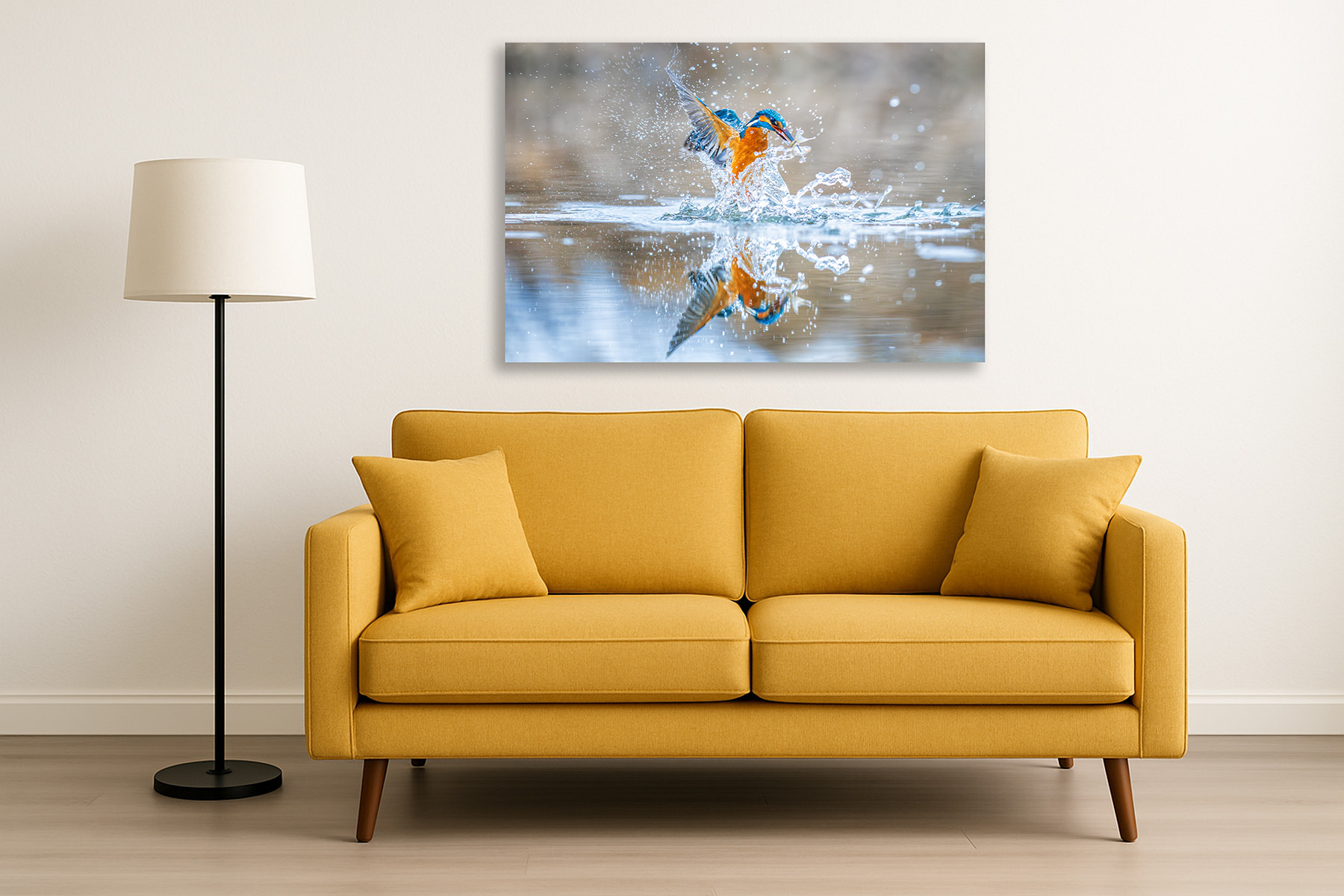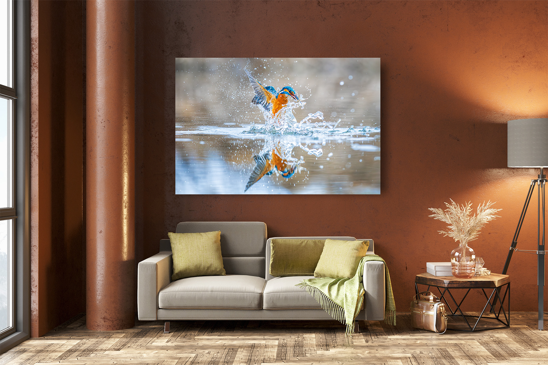 The water erupts in a dazzling explosion of droplets as the kingfisher bursts upward, its wings cutting through the air like flashes of living color. Blue and amber blaze against the soft, quiet background while the river shatters into sparkling fragments around the bird. In its beak, the small silver fish glints briefly—a prize earned through instinct and lightning-fast precision.