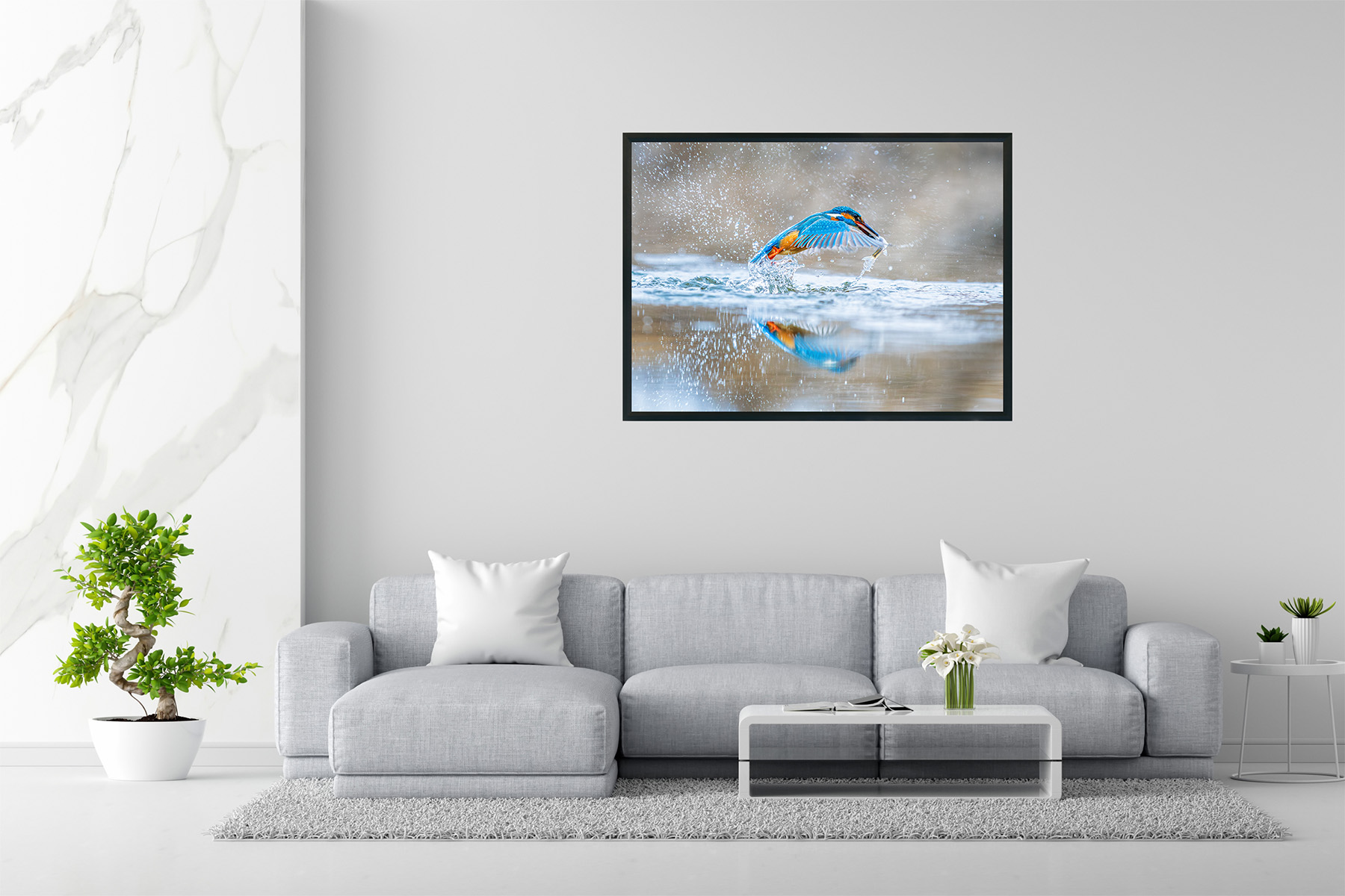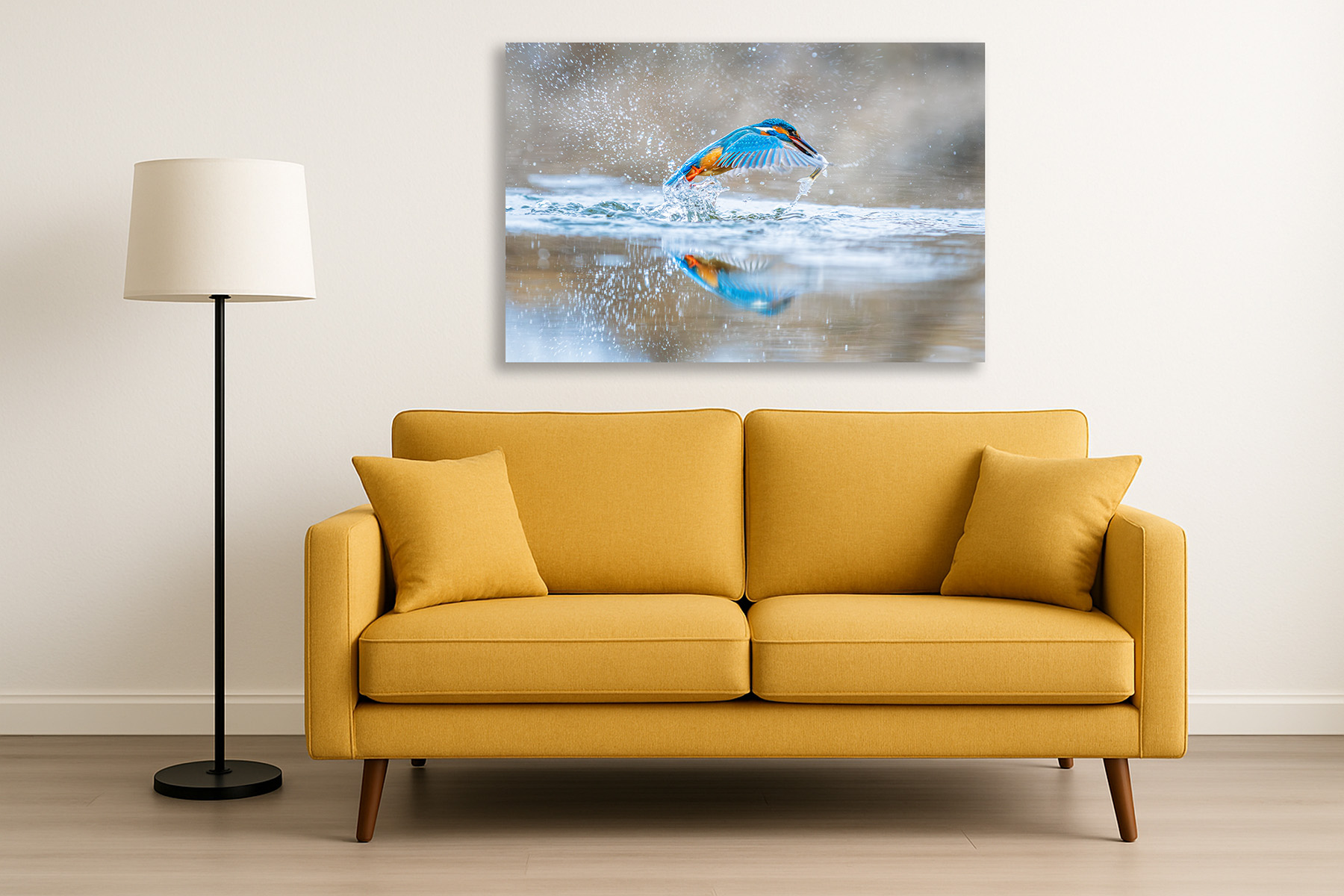 Blue and amber blaze against the soft, muted background, turning this act of survival into a luminous ballet. The reflection below trembles, mirroring the bird’s fierce ascent, as if the river itself cannot let go of the brilliance that just pierced through it.
