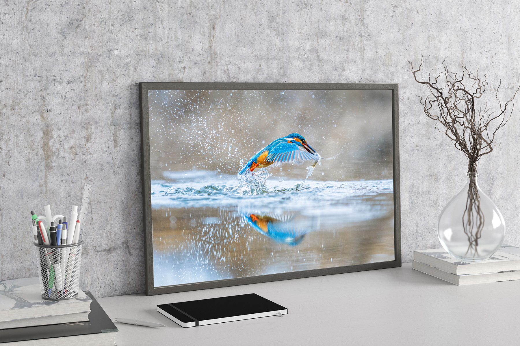 In a burst of liquid light, the kingfisher explodes from the surface, its wings spread wide like painted silk against a storm of sparkling droplets. The water fractures beneath it, rising in crystalline arcs, while the small silver fish glints in its beak—a fleeting life caught in a moment of pure instinct.
